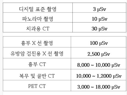 이 수치를 기준으로 치과 엑스레이의 노출량을 비교해 보면 훨씬 낮다는 것을 알 수 있습니다.