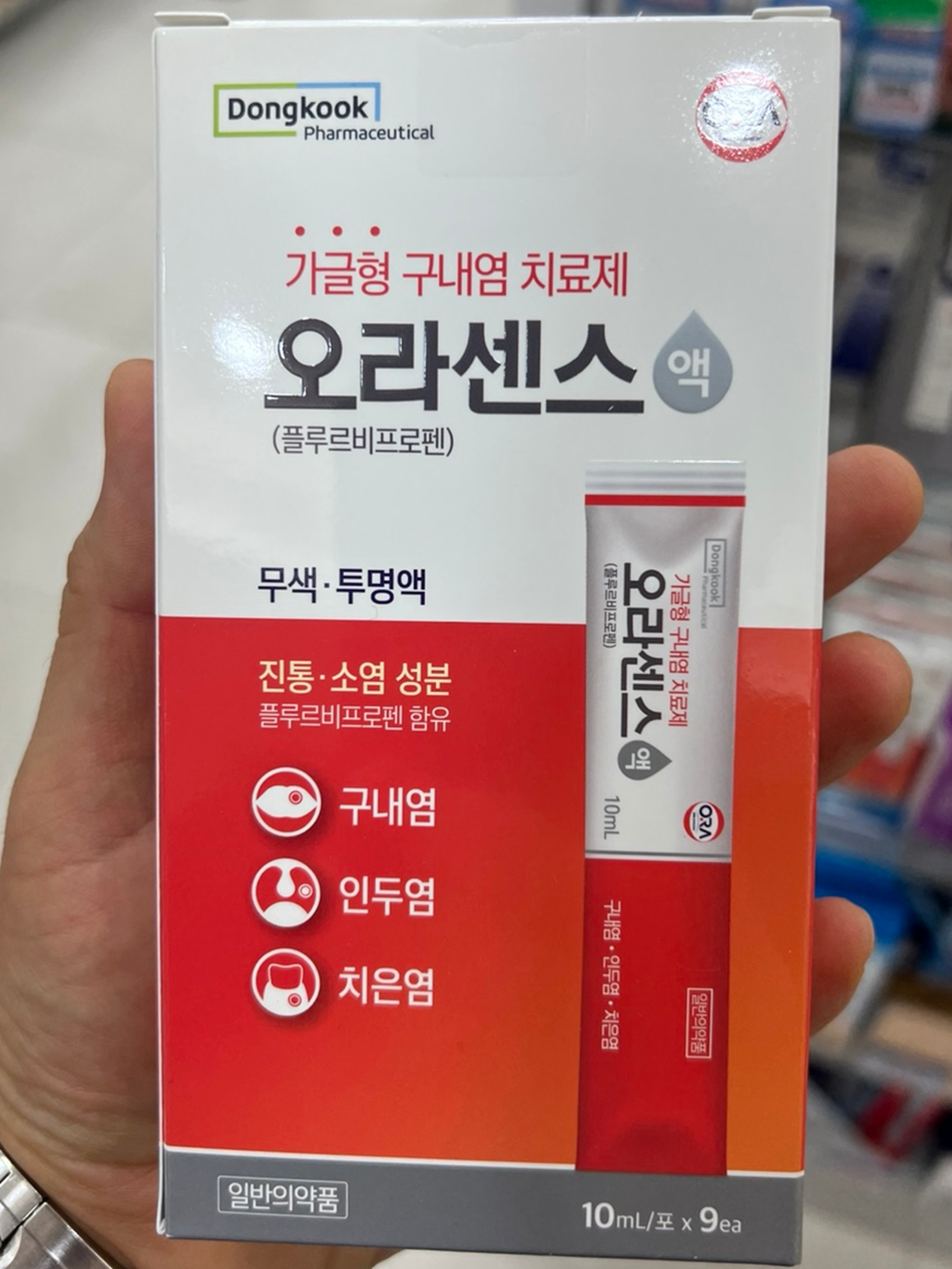 오라센스액의 핵심은 바로 플루르비프로펜, 이 성분은 비스테로이드성 소염진통제로 구내염 부위에