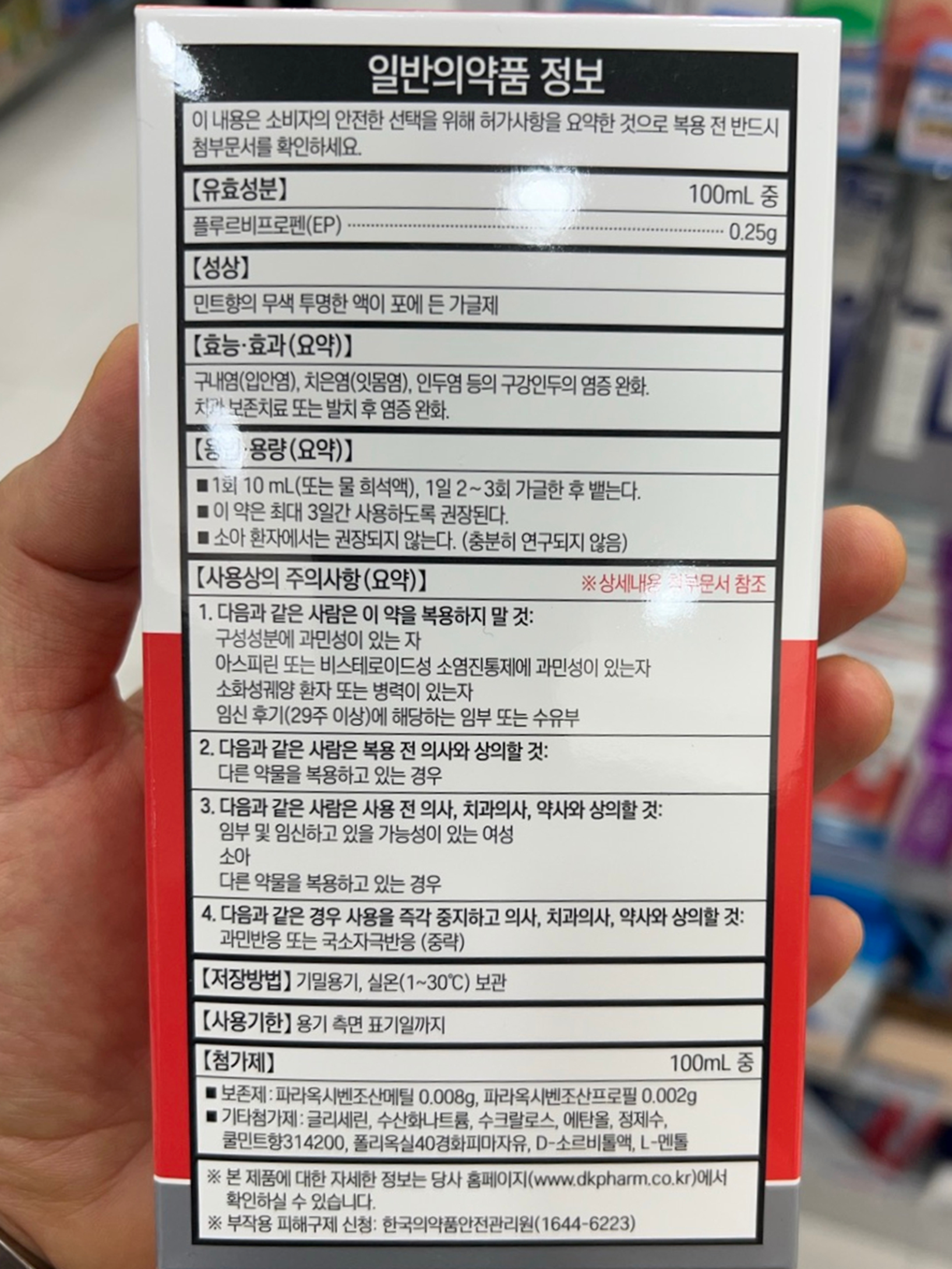 하루 1-3회, 1회당 10-15mL 정도를 입에 머금고 30초에서 1분 정도 가글한 후 뱉으면 됩니다.